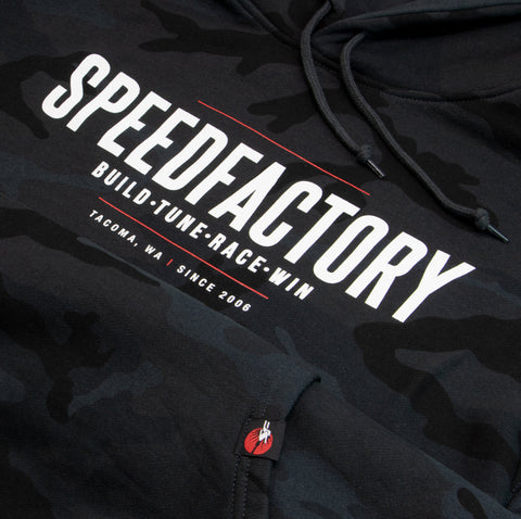 The SpeedFactory Racing BTRW (BUILD-TUNE-RACE-WIN) Hoodie in black camo!